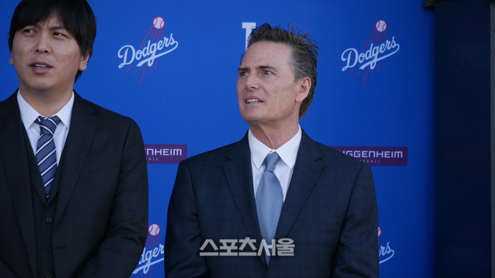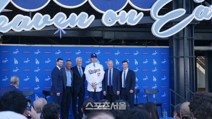 오타니 입단이 다저스 구단에 큰 의미 부여는 수뇌부와 전 직원 참석에서 알 수 있다. 다저스 구단은 잔치 분위기였다. 구단주 마크 월터 회장, 스탠 컈스텐 사장, 앤드류 프리드먼 베이스볼 오퍼레이션 사장, 오타니 쇼헤이, 통역 미즈하라 이페이, 에이전트 네즈 발레로 등이 연단에 올랐다. 데이브 로버츠 감독은 연단 아래 좌석에 앉았다.