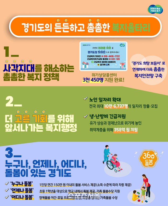 〔스포츠서울│수원=좌승훈기자〕민선 8기 경기도는 긴급복지 핫라인, 취약계층 냉난방 긴급지원, 장애인 누림통장 등 적극적이고 선제적 복지정책과 함께 최근 360° 전방위 돌봄이란 새로운 복지정책 패러다임으로 복지 그물망을 더 촘촘히 하고 있다.