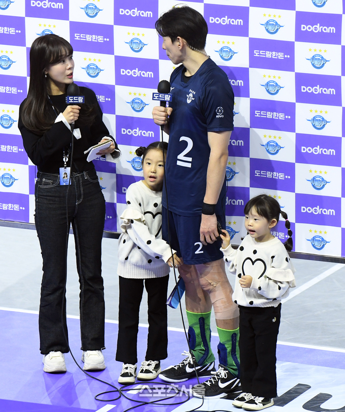 대한항공 세터 한선수(가운데)가 7일 인천 계양체육관에서 열린 2023-2024 V리그 현대캐피탈과 경기에서 세트 스코어 3-0 승리를 이끈 뒤 두 딸과 함께 인터뷰를 하고 있다. 2023. 12. 17. 인천 | 박진업기자 upandup@sportsseoul.com