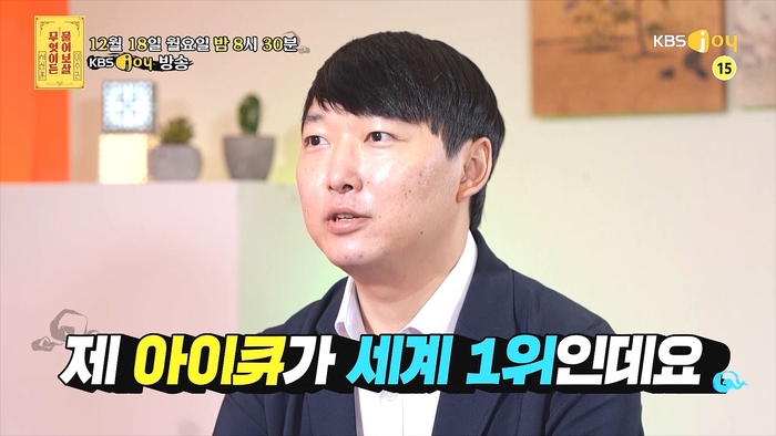 “아이큐가 한국뿐만 아니라 세계 1위”라고 운을 뗀 사연자는 실제 아이큐 검사 결과 204점을 기록했고 한국기록원 공식 고지능 검사에서 최고 점수를 받아 영재 발굴 프로그램에 방송 최초 성인 영재로 출연했으며, 공식적으로 쓰이는 ‘웩슬러 검사’에서도 만점을 받아 공식 국제 기준 아이큐 160 이상이라고 소개한다.