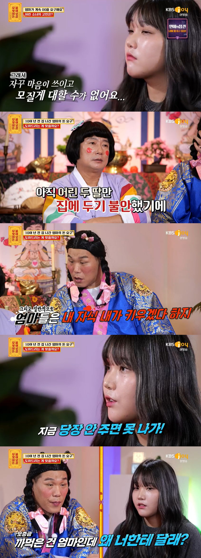 18일 방송된 KBS joy ‘무엇이든 물어보살’에서 10년전 가출했던 엄마가 연락을 해와 돈을 요구했다는 사연이 공개됐다.