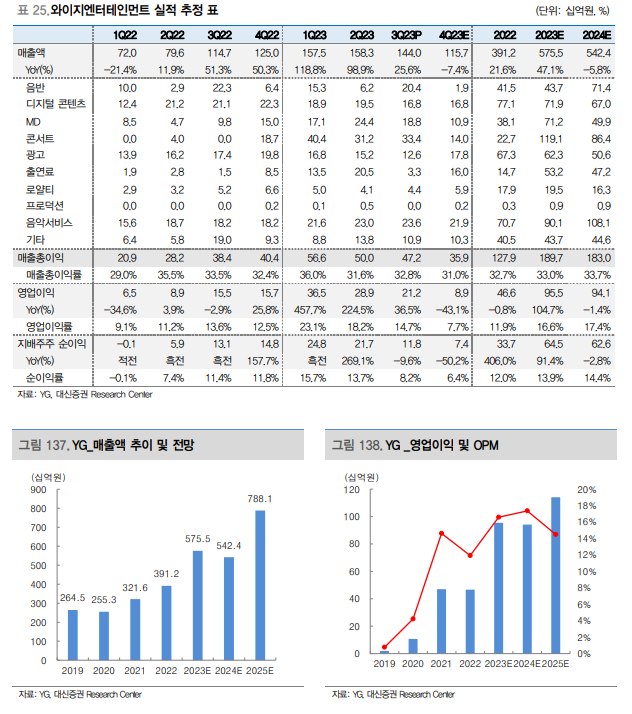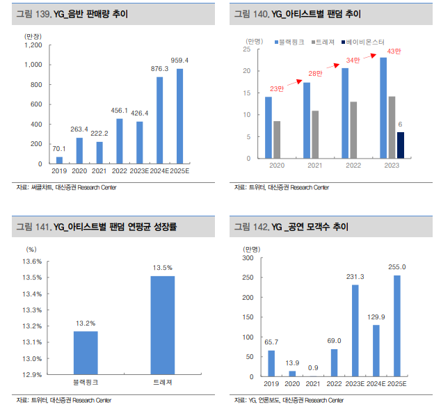 이어 “멤버 개인 전속 계약은 여전히 협의중이나 이는 이미 상당부분 주가에 반영되어, 2인 이상의 재계약 발표 시 오히려 주가 상승 요소로 작용될 개연성이 높다. 다만 보수적인 관점에서 블랙핑크의 휴식기로 빠르면 내 년 4분기부터 음반→공연 순서로 재개될 것으로 전망된다. 이에 따라 그룹 재계약에 따른 매출 증가는 2025년부터 본격화될 것”이라고 전망했다.