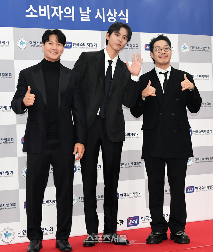 가수 김종국(왼쪽)과 모델 주우재(가운데), 가수 하하가 19일 서울 강남구 한국과학기술회관에서 진행된 제28회 소비자의 날 KCA 문화연예 시상식에서 취재진을 향해 포즈를 취하고 있다. 2023. 12. 19. 박진업기자 upandup@sportsseoul.com