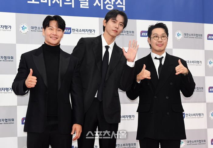 가수 김종국(왼쪽)과 모델 주우재(가운데), 가수 하하가 19일 서울 강남구 한국과학기술회관에서 진행된 제28회 소비자의 날 KCA 문화연예 시상식에서 취재진을 향해 포즈를 취하고 있다. 2023. 12. 19. 박진업기자 upandup@sportsseoul.com