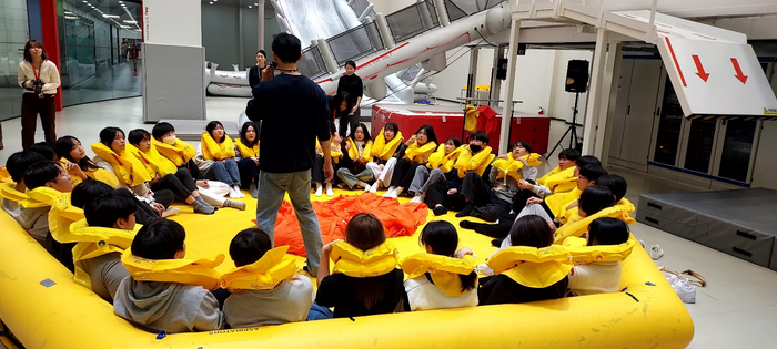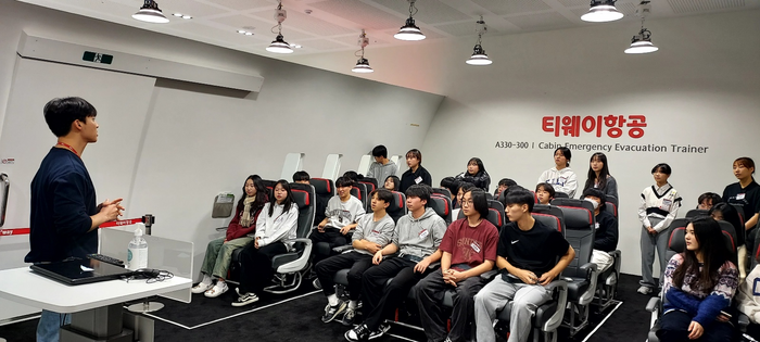 이날, 학생들은 티웨이항공 훈련센터(서울 강서구)를 방문하여 항공 산업에 대한 전반적인 이해를 높이고, △비상탈출 슬라이드 실습 △비상구 개방 △화재진압 실습 등 항공 안전 훈련을 통해 비상 상황에서의 대처 능력을 높였다.