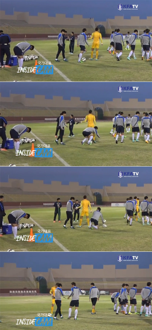 영상 속 구자철과 손흥민은 슈틸리케 감독의 집합 명령에 경기장 한가운데로 이동했다.
