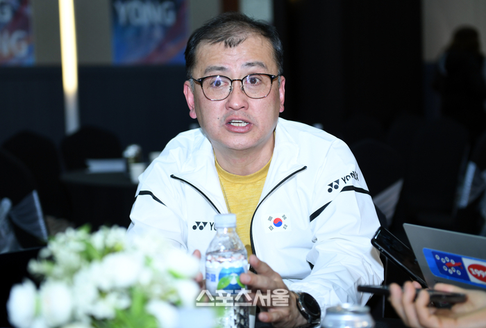 배드민턴 대표팀 김학균 감독이 20일 서산 베니키아호텔에서 열린 ‘2023 국가대표 배드민턴 선수단 포상식’ 후 기자들과 인터뷰를 하고 있다. 2023. 12. 20. 서산 | 최승섭기자 thunder@sportsseoul.com