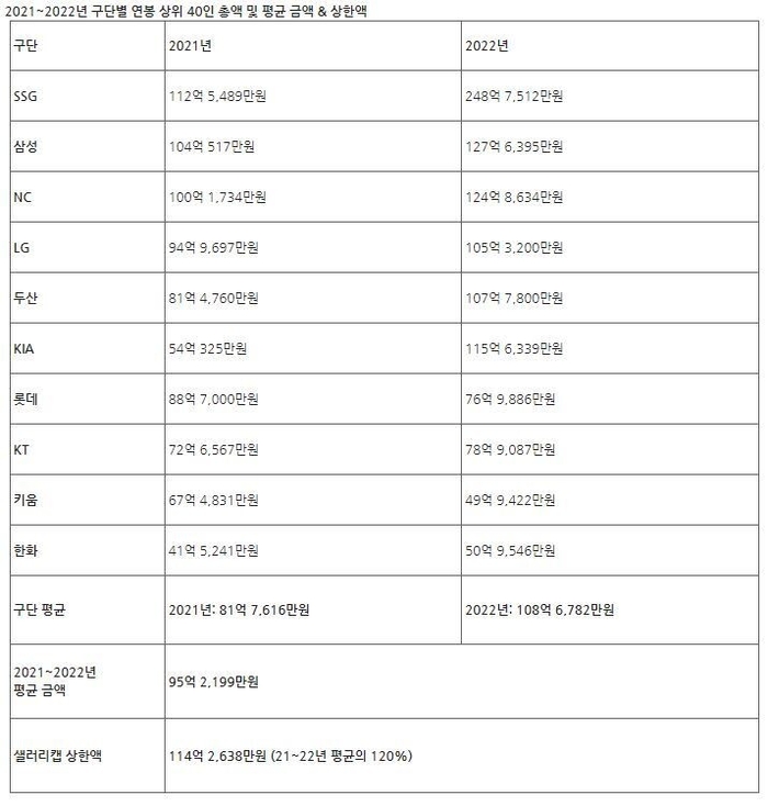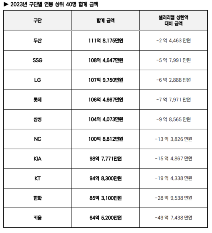 2023년 샐러리캡을 초과한 구단은 없다. 예고된 일이다. 지난겨울부터 모든 구단이 114억원2638만원 이하로 상위 40위 연봉 총액을 맞추려 했다.