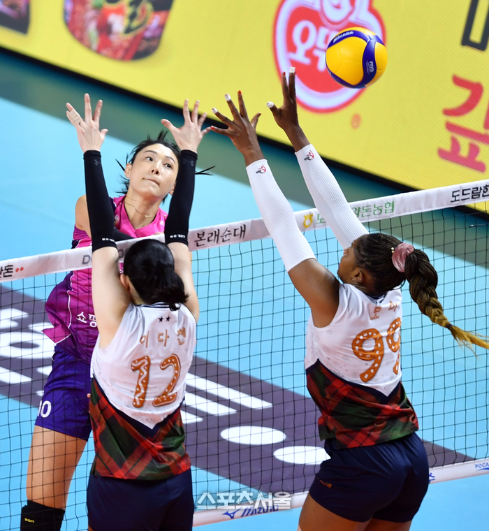 흥국 김연경이 20일 삼산월드체육관에서 열린 2023-2024 도드람 V리그 여자부 흥국생명과 현대건설의 경기에서 모마 이다현 이중블로킹위로 강타를 시도하고 있다. 2023.12.20. 인천 | 강영조기자 kanjo@sportsseoul.com