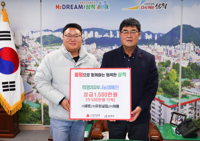 전국 | 강원 (주)세명·(주)유림실업·(주)바름 안중헌 대표, 삼척시에 이웃돕기 성금 1,500만원 기탁 입력2023-12-21 12:00:08 북마크 페이스북 트위터 SNS 더보기 가글자크기설정 인쇄 SNS 더보기 닫기 네이버밴드 네이버블로그 URL복사 글자크기 설정 메뉴 닫기 글자크기 설정 시 다른 기사의 본문도동일하게 적용됩니다. 가 가 가 가 가 [스포츠서울ㅣ김기원기자] (주)세명·(주)유림실업·(주)바름의 안중헌 대표가 각 회사별 500만원씩 1,500만원을 이웃돕기 성금으로 21일 삼척시에 기탁했다.acdcok4021@sportsseoul.com 기사추천 0