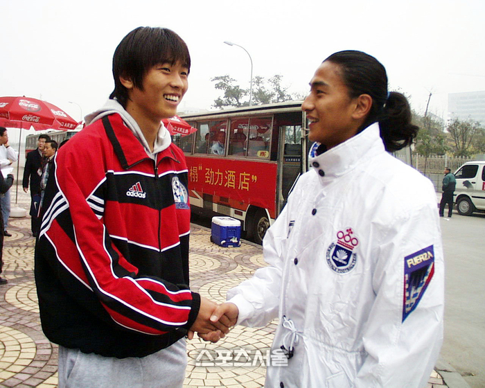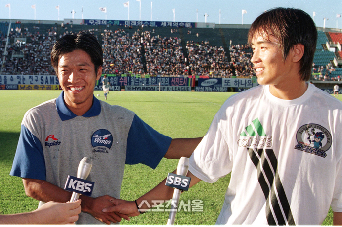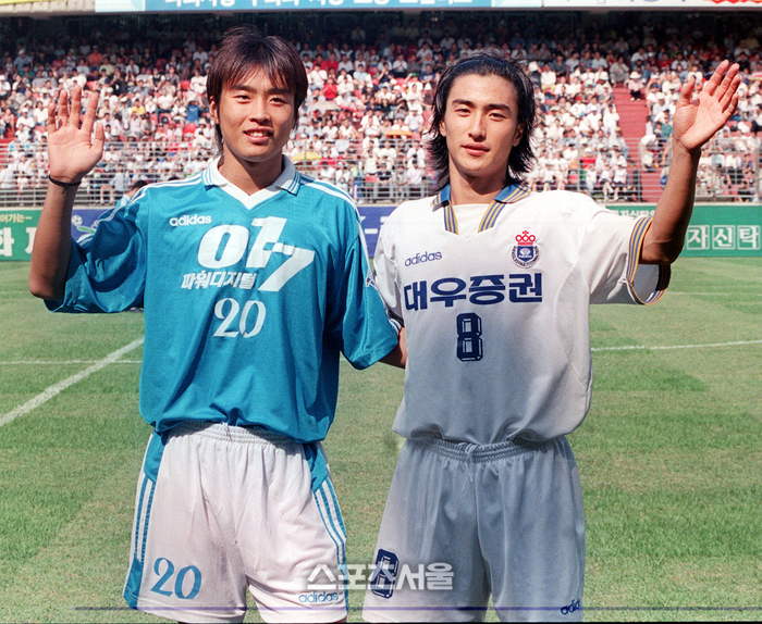 전시회는 K리그 40년 역사를 ‘우주(Universe)’로 표현, 13개 구역으로 나뉘어 다양한 방식으로 조명했다. 그중 호라이즌(HORIZON) 구역은 30여 미터 길이 벽면을 따라 사진을 나열, K리그 40년 역사를 순서대로 바라보게 했다. 1983년부터 2023년까지 연도별 우승팀 엠블럼이 새겨져 있고, 시기마다 주요 사진이 당시 사진과 함께 배치됐다. 총 83개 사건과 74개 사진이 삽입됐는데, 각 언론사 데이터베이스에서 제공한 게 여럿 있다. 스포츠서울은 가장 많은 30개의 사진을 제공했다. 그리고 주목받은 사진 중 하나가 과거 부산 대우 안정환과 포항의 이동국이 지난 1999년 2월11일 아시안클럽선수권대회에서 맞대결을 앞두고 포즈를 한 것이다.