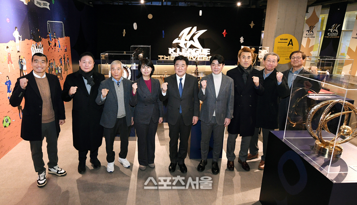 21일 서울 영등포구 타임스퀘어에서 진행된 K리그 40주년 기념 전시회 ‘K리그 더 유니버스’ 시사회에서 참석자들이 설명 투어에 앞서 기념촬영을 하고 있다. 왼쪽부터 조원희 전 선수, 허정무 전 대전하나시티즌 이사장, 이회택 OB축구회 회장, 김연수 한국프로축구연맹 이사, 권오갑 한국프로축구연맹 총재, 윤정환 강원FC 감독, 김병지 강원FC 대표이사, 조연상 한국프로축구연맹 사무총장, 한웅수 한국프로축구연맹 부총재. 2023. 12. 21. 박진업기자 upandup@sportsseoul.com