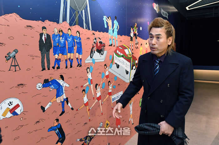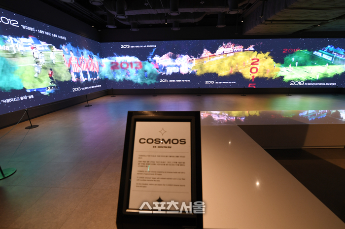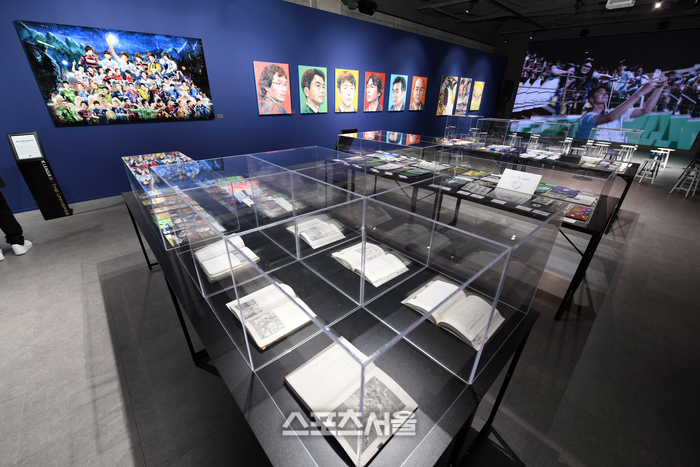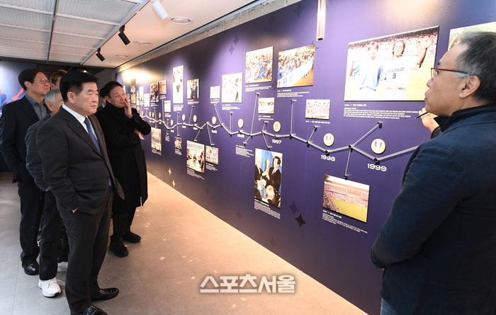 눈길을 가장 오래 머물게 한 건 30여m 벽면에 40년 역사를 사진으로 나열한 ‘호라이즌(HORIZON)’ 구역이다. 각 언론사 사진 데이터베이스에서 제공한 게 여럿 있는데, 스포츠서울도 다수 사진을 제공했다. 프로축구 출범 초기인 1987년 축구장에 뜬 치어리더, 1998년 골키퍼 최초로 득점에 성공한 김병지, 2000년대 일화 왕조를 구축한 ‘앳된 얼굴’의 김학범 현 제주 감독 등이 눈길을 끌었다. 위 이사는 “프로 초창기에 야구처럼 치어리더를 뒀는데 축구장엔 맞지 않는다며 배척하던 분위기도 있었다. 이후 서포터 문화가 등장, 지금까지 이어졌다”고 돌아봤다.