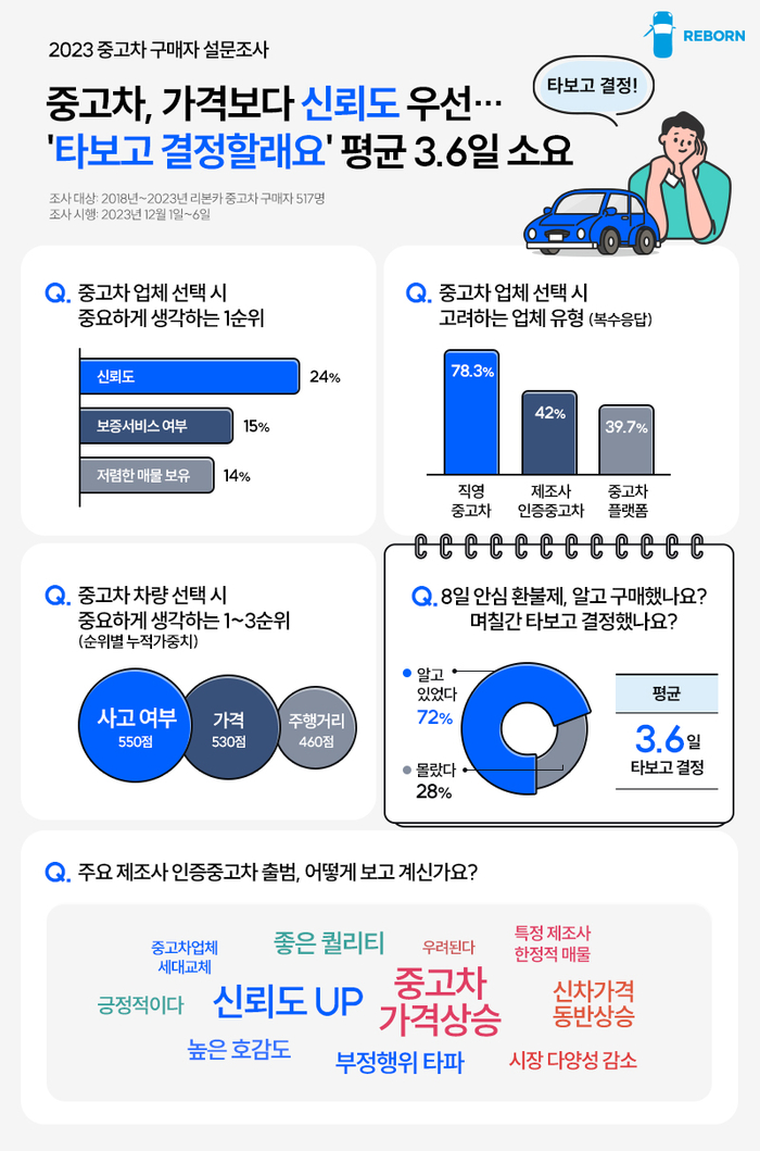 설문조사에 따르면 소비자는 중고차 구매시 낮은 가격보다 신뢰도를 중시하며 최근 제조사 인증중고차의 시장 진입엔 긍정 입장을 보였다.