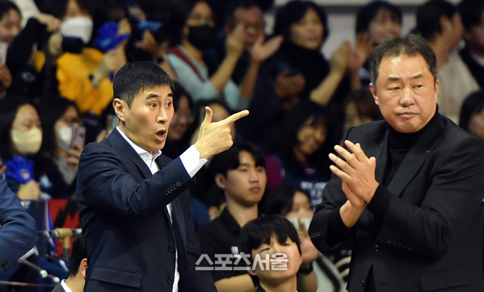 KCC 전창진 감독이 22일 안양실내체육관에서 열린 2023-2024프로농구 안양정관장과 부산KCC 경기에서 선수들에 박수를 치며 이상민 코치와 응원하고 있다. 2023.12.22. 안양 | 강영조기자 kanjo@sportsseoul.com