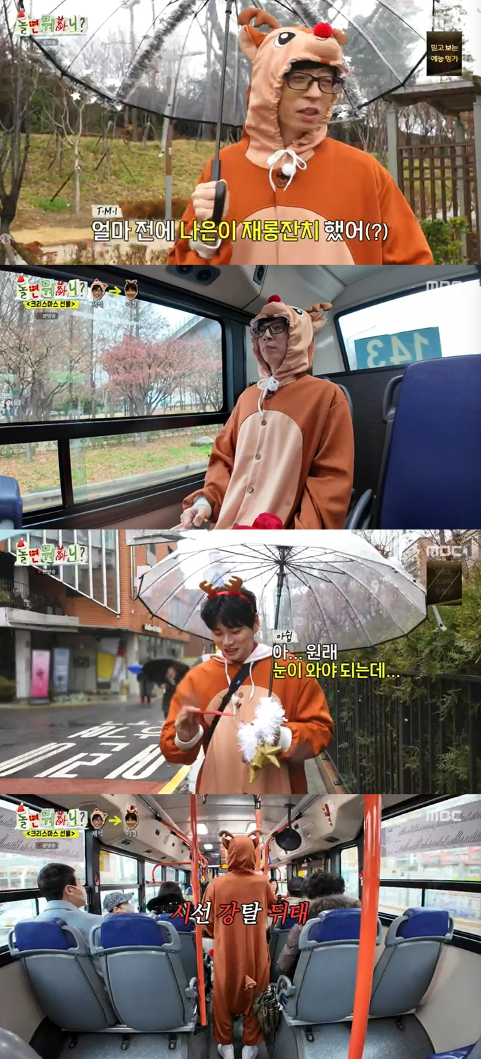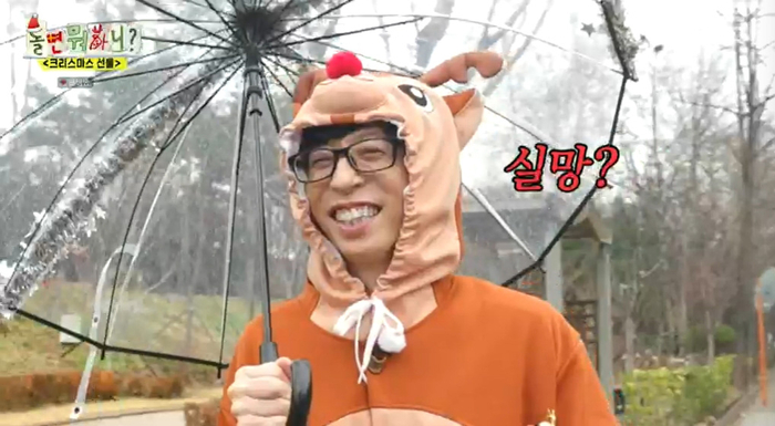 23일 방송된 MBC ‘놀면 뭐하니?’에서 유재석은 제작진의 요청으로 루돌프 전신의상을 입고 눈꽃 장식이 된 우산까지 챙겨들고 등장했다.