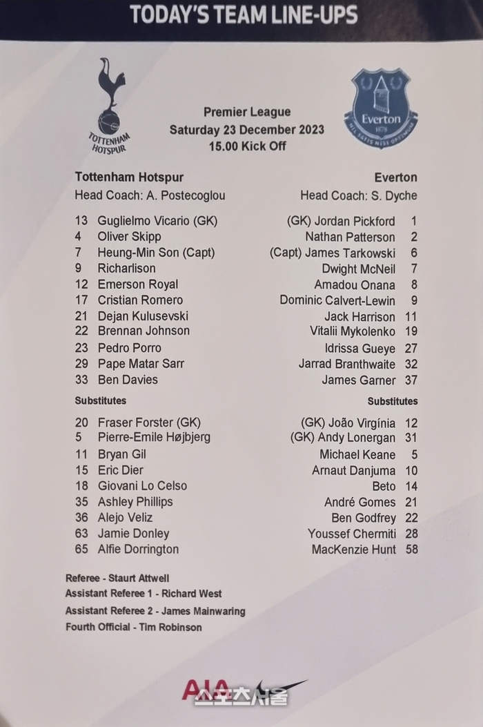 토트넘은 24일(한국시간) 영국 런던 토트넘 홋스퍼 스타디움에서 2023~2024 잉글랜드 프리미어리그(EPL) 18라운드 에버턴과 맞대결을 치른다. 최근 2연승을 달리고 있는 토트넘은 3연승을 노린다. 이날 승리하면 4위까지 도약할 수 있다.
