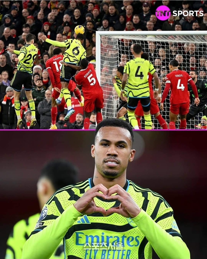 아스널은 이날 경기 초반 선제골을 뽑아내며 기세를 올렸다. 전반 3분 리버풀 이브라힘 코나테의 반칙으로 카이 하베르츠가 프리킥을 얻어낸 상황. 마틴 외데고르의 크로스를 가브리엘 마갈량이스가 멋진 헤더골로 연결시킨 것이다.