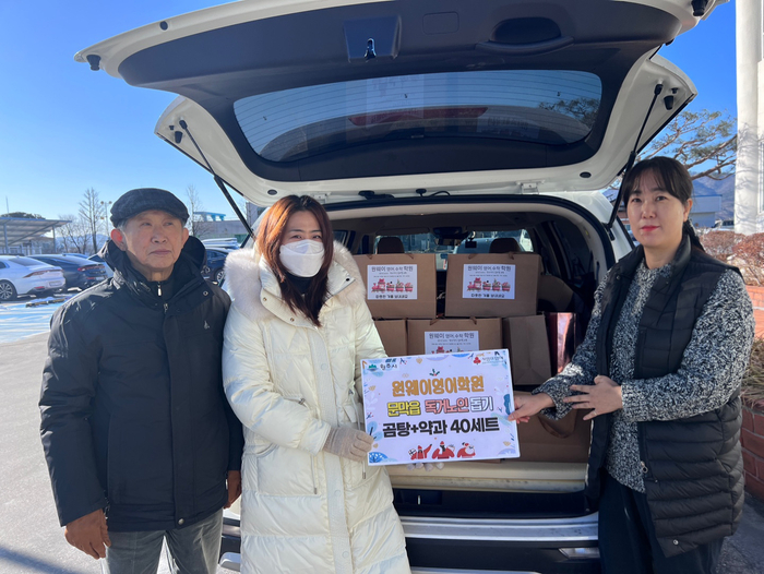 [스포츠서울ㅣ원주=김기원기자] 원주시 문막읍 원웨이영어학원(대표 이은율)은 지난 22일 저소득 노인분들에게 사랑이 듬뿍 담긴 선물(약과, 사골곰탕) 40세트를 문막읍행정복지센터에 전달했다.
