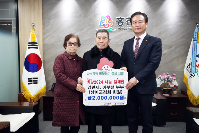 [스포츠서울ㅣ김기원기자] 상이군경회 회원 김완제, 이부선 부부는 지난 12월 22일 홍천군청을 방문, 홍천군 ‘희망 2024 나눔캠페인’에 성금 200만원을 기탁했다.