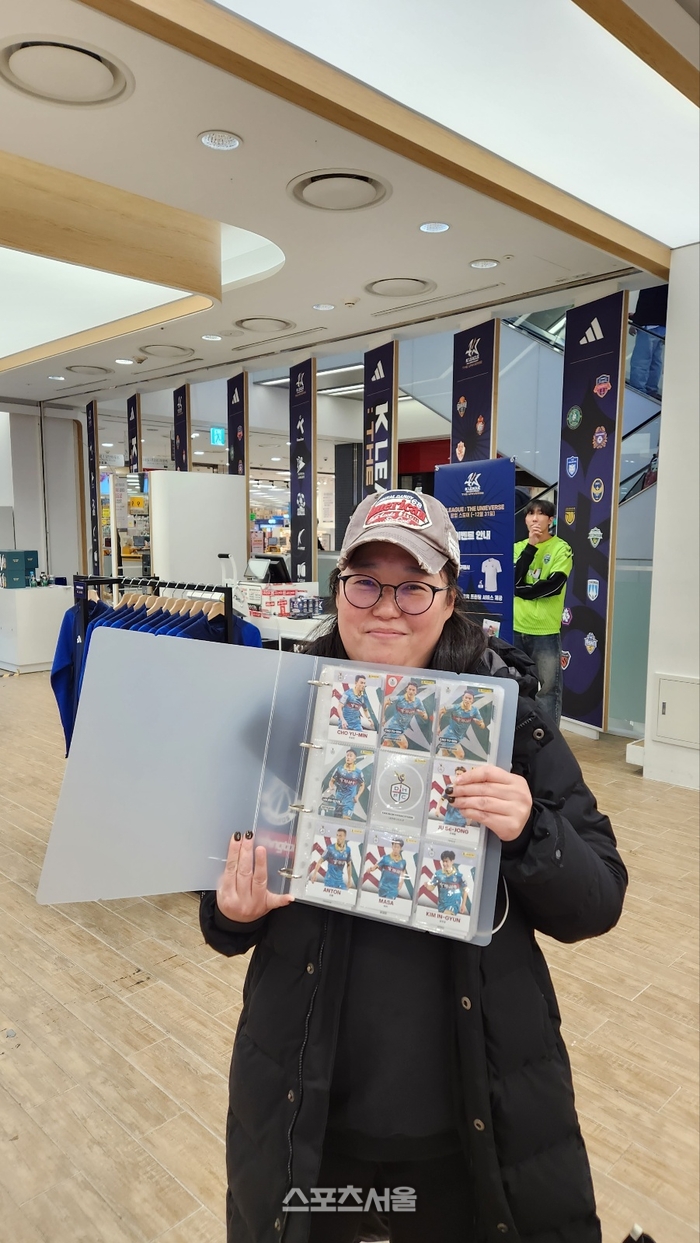 박 대표는 “매출의 가장 큰 비중을 차지하는 건 인기 선수 사진이 들어가 있는 K리그 파니니 프리즘 카드(1박스 10팩.16만8000원)”라고 했다. 파니니 카드는 앞서 편의점에도 판매돼 큰 인기를 누렸다. 1팩당 랜덤으로 카드가 들어가 있는데, 팝업스토어 내엔 팬끼리 원하는 카드를 교환하는 구역도 존재한다. 대전하나시티즌이 2부에 있을 때부터 경기장을 다녔다는 장순기(44) 씨는 직접 모은 다량의 카드를 지참해 팝업스토어를 방문했다. 그리고 중복된 선수 카드를 내놓았다. 그는 “본래 대전 선수만 모으다가 (다른 구단까지) 찾게 됐다”고 웃으며 “중복된 카드를 내가 갖고 있는 것보다 다른 팬과 나누면 더 기쁘지 않겠느냐”고 웃었다. 팝업스토어에서는 굿즈 1만 원 이상 구매 고객을 대상으로 40주년 기념 한정판 프로모션 카드도 주고 있다.
