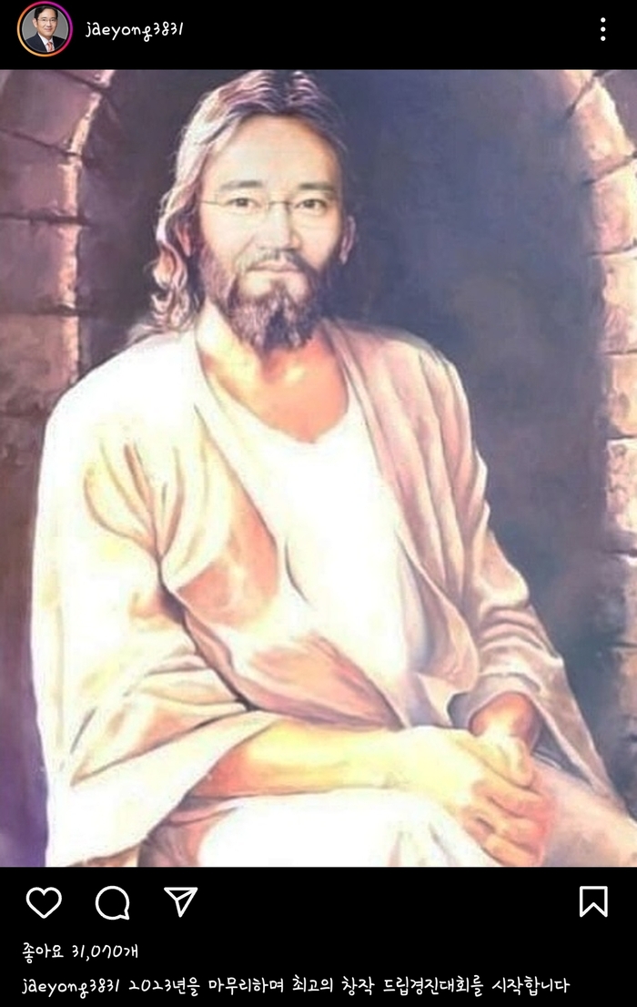 ‘2023년을 마무리하며 최고의 창작 드립경진대회를 시작합니다’라는 글과 함께 예수의 초상화에 이 회장의 얼굴이 합성된 게시물이다.