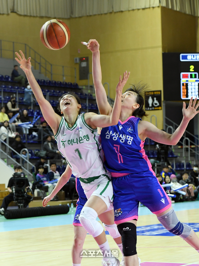 하나원큐 신지현(왼쪽)이 27일 용인체육관에서 열린 2023-2024 여자프로농구 삼성생명과 경기에서 슛을 하다 삼성생명 이주연에게 블로킹을 당하고 있다. 2023. 12. 27. 용인 | 박진업기자 upandup@sportsseoul.com