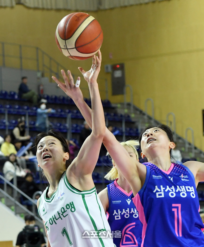 하나원큐 신지현(왼쪽)이 27일 용인체육관에서 열린 2023-2024 여자프로농구 삼성생명과 경기에서 삼성생명 이주연과 리바운드를 다투고 있다. 2023. 12. 27. 용인 | 박진업기자 upandup@sportsseoul.com