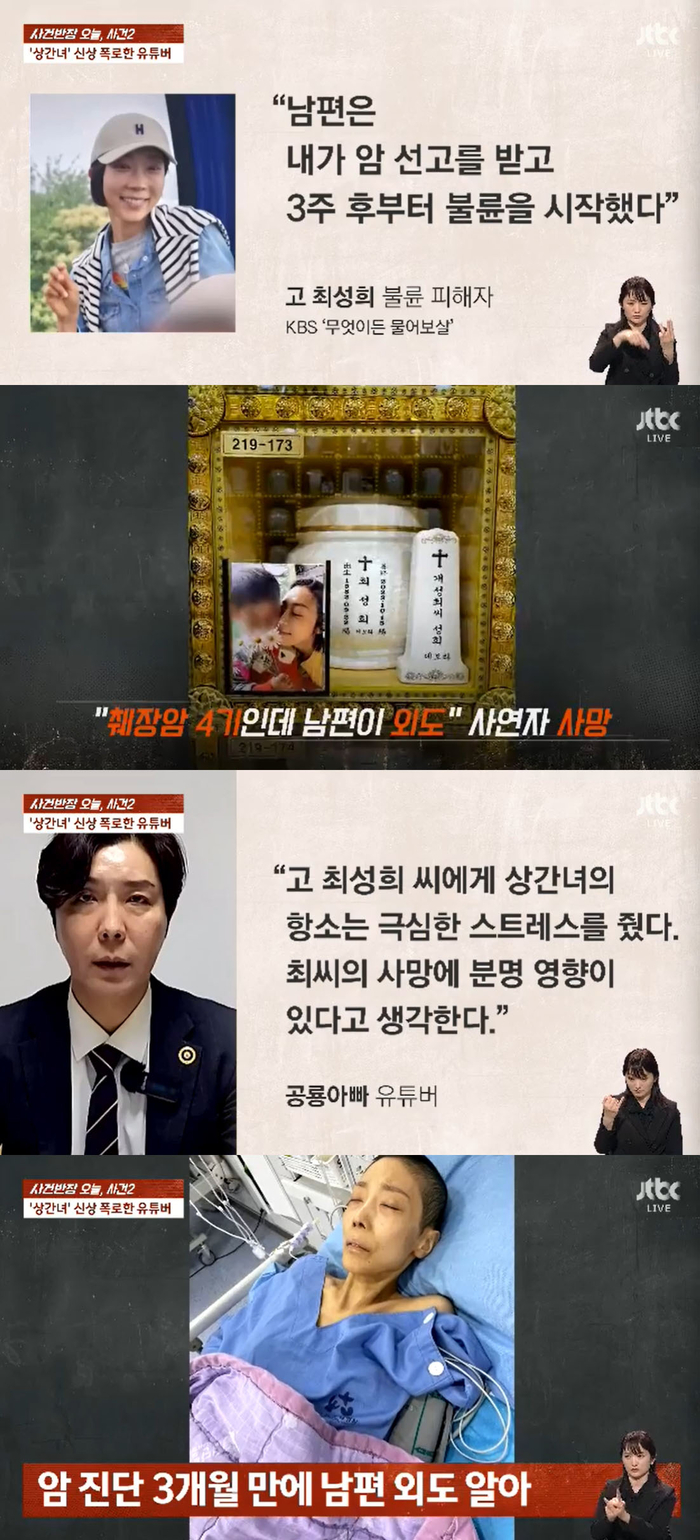 지난 9월 췌장암 4기 투병 중 KBS joy ‘무엇이든 물어보살’에 출연했던 고 최성희씨는 “암 선고 받고 3주 후부터 남편이 불륜을 시작했다. 남편은 체육관 관장인데, 관원과 불륜을 벌였다”라고 폭로한 바 있다.