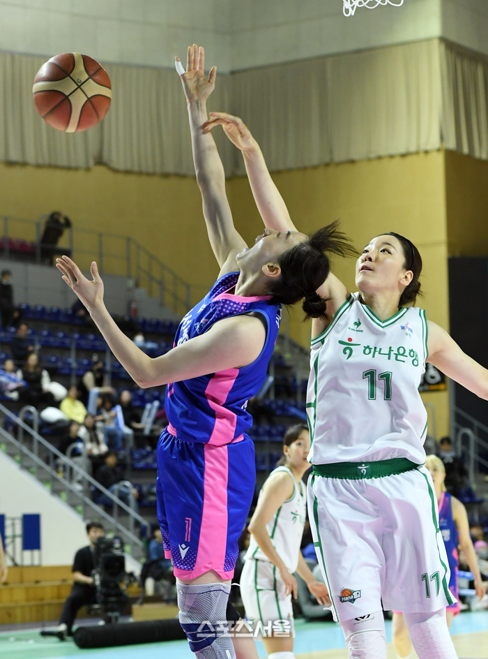 하나원큐 양인영(오른쪽)이 27일 용인체육관에서 열린 2023-2024 여자프로농구 삼성생명과 경기에서 삼성생명 이주연의 슛을 블록하고 있다. 2023. 12. 27. 용인 | 박진업기자 upandup@sportsseoul.com