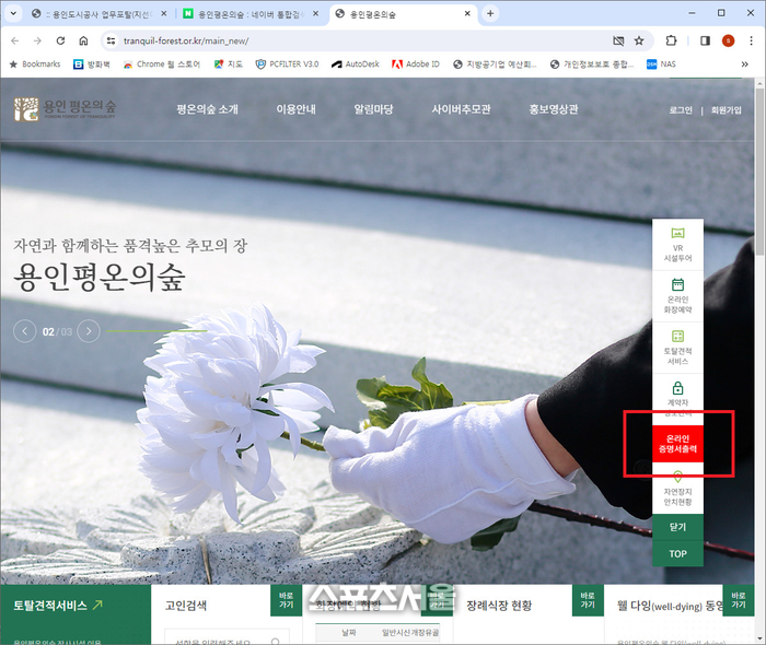 용인평온의숲 홈페이지 내에서 발급받을 수 있는 서비스는 화장증명서, 자연장증명서, 봉안증명서다. 이 서류은 화장사실 확인이나 장지 이전 시 필요한 것으로, 온라인 발급을 통해 시민들은 더욱 편리하게 이용할 수 있을 것으로 기대된다.