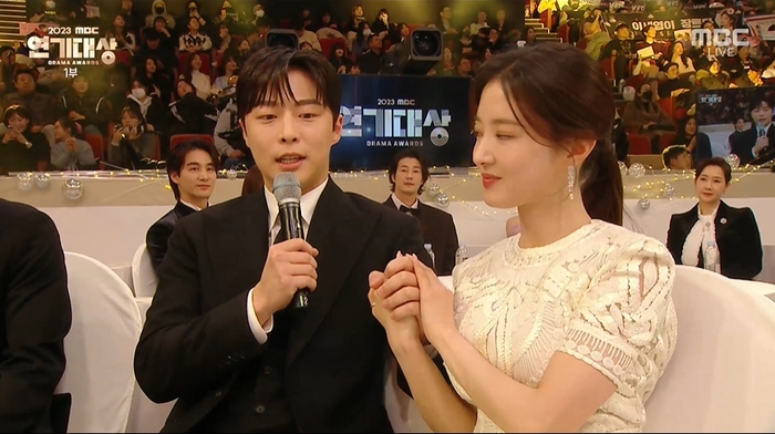 지난 2021년 ‘옷소매 붉은 끝동을’에서 이준호와 베스트 커플상을 받은 이세영은 “이제 저는 새 남자와 결혼했다”며 배인혁과 손을 꼭 잡았다.