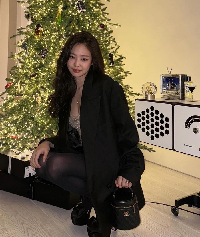 공개한 사진에는 연말 연휴를 보내는 제니의 모습이 담겼다. 크리스마스 트리 옆에 선 제니는 상아색 니트 원피스를 입어 각선미를 뽐냈다.