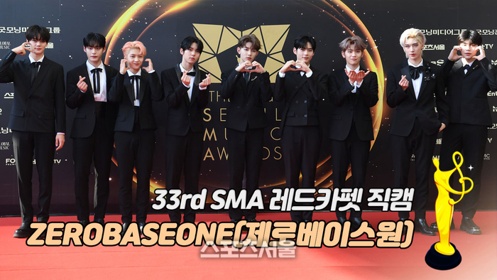 신인상과 본상을 수상한 그룹 제로베이스원(ZEROBASEONE)이 레드카펫에서 포즈를 취하고 있다.