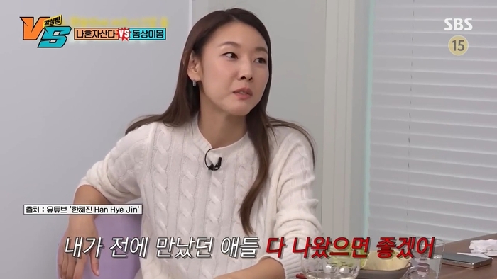 한혜진은 자신의 유튜브 채널에서 “남자들은 내가 전에 만났던 애들 다 나왔으면 좋겠다”라고 밝혔다.