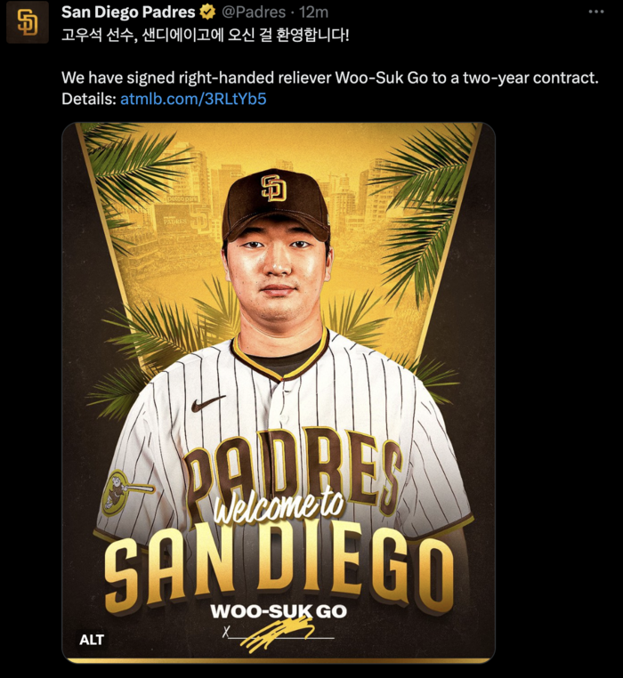 미국 언론은 한국시간으로 4일 오전 샌디에이고와 고우석의 계약이 마무리됐음을 알렸다. 샌디에이고 구단도 공식 SNS를 통해 고우석의 입단 소식을 전했다. 한글로 ‘고우석 선수, 샌디에이고에 오신 걸 환영합니다!’고 썼다.