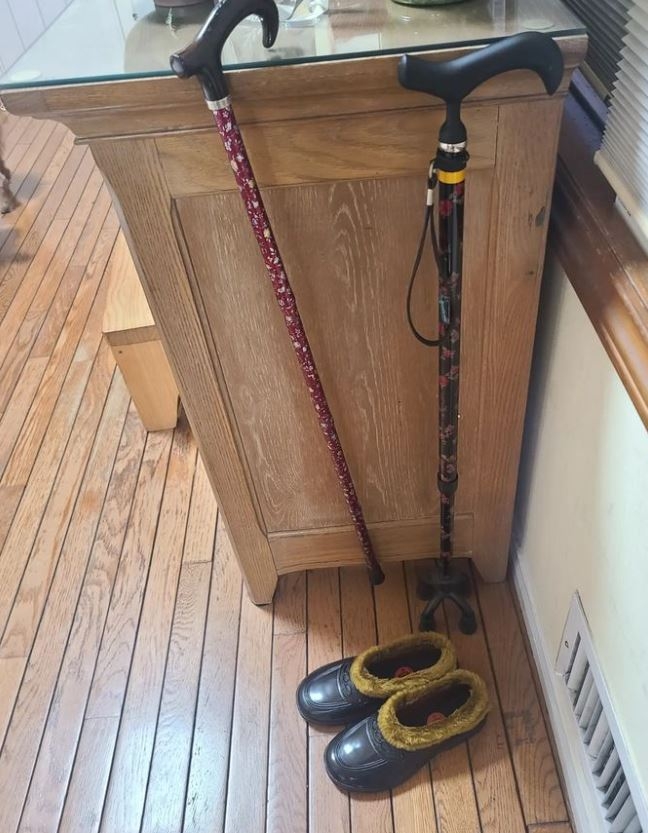 사진에는 양희은이 어머니 故 윤순모 여사를 위해 구입한 털신이 놓여져 있고, 그 옆에는 지팡이 두 개가 있다.