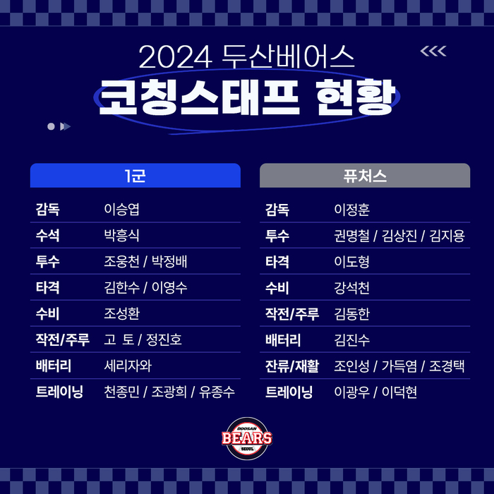 [스포츠서울 | 윤세호기자] 두산이 2024시즌 코칭스태프를 발표했다.