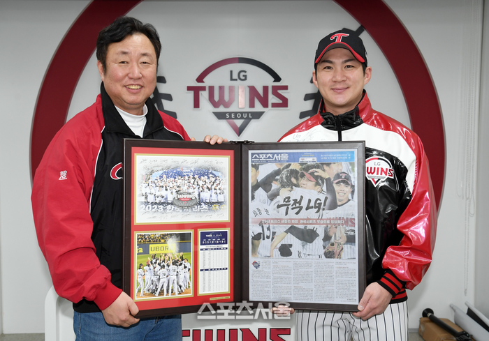 LG 트윈스 차명석 단장(왼쪽)과 주장 오지환이 5일 잠실구장에서 스포츠서울로부터 우승을 기념해 특별히 제작된 액자를 전달받고 기념촬영을 하고 있다. 29년 만의 우승을 기념해 특별히 제작된 액자에는 1994년과 2023년 우승 소식을 실은 신문과 사진들이 담겨져 있다. 2023. 1. 5. 박진업기자 upandup@sportsseoul.com