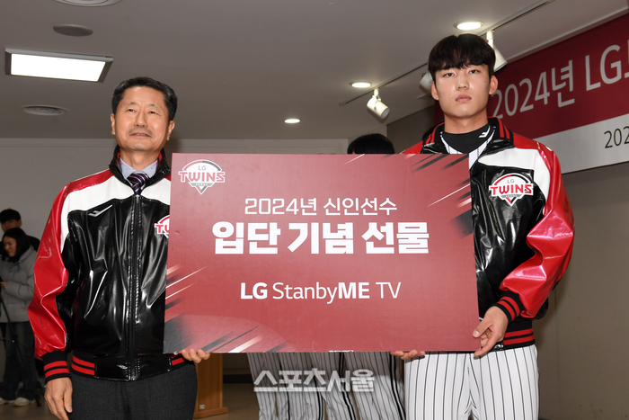 LG스포츠 김인석 대표이사(왼쪽)가 5일 잠실구장에서 진행된 ‘2024년 LG 트윈스 신년 인사회’에서 신인 선수인 김현종에게 입단 기념 선물을 전달하고 있다. 2023. 1. 5.