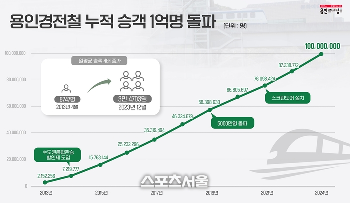 〔스포츠서울│용인=좌승훈기자〕경기 용인시는 용인경전철 개통 11년 만에 누적 승객 1억명을 돌파했다고 6일 밝혔다.