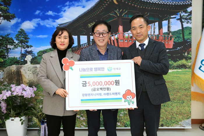 [스포츠서울ㅣ김기원기자] 강원엔지니어링(대표 인선희)과 (주)랜드이엔지(대표 인선희)는 지난 5일 인제군청을 방문하여 어려운 이웃을 위해 써달라며 성금 500만원을 기탁했다. (강원엔지니어링․랜드이엔지 대표 동일)