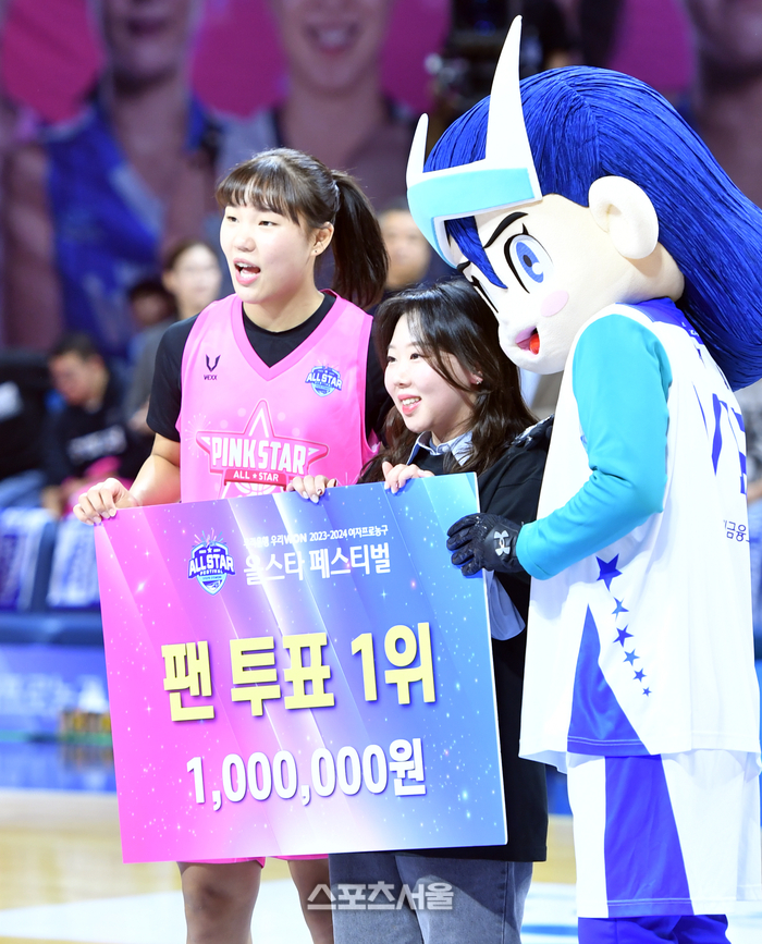 최다득표를 기록한 박지현이 7일 아산 이순신체육관에서 열린 우리은행 우리WON 2023-2024 WKBL 핑크스타와 블루스타 올스타전에서 최다득표상을 수상한 후 팬과 기념촬영을 하고 있다 . 2024.01.07. 아산 | 강영조기자 kanjo@sportsseoul.com