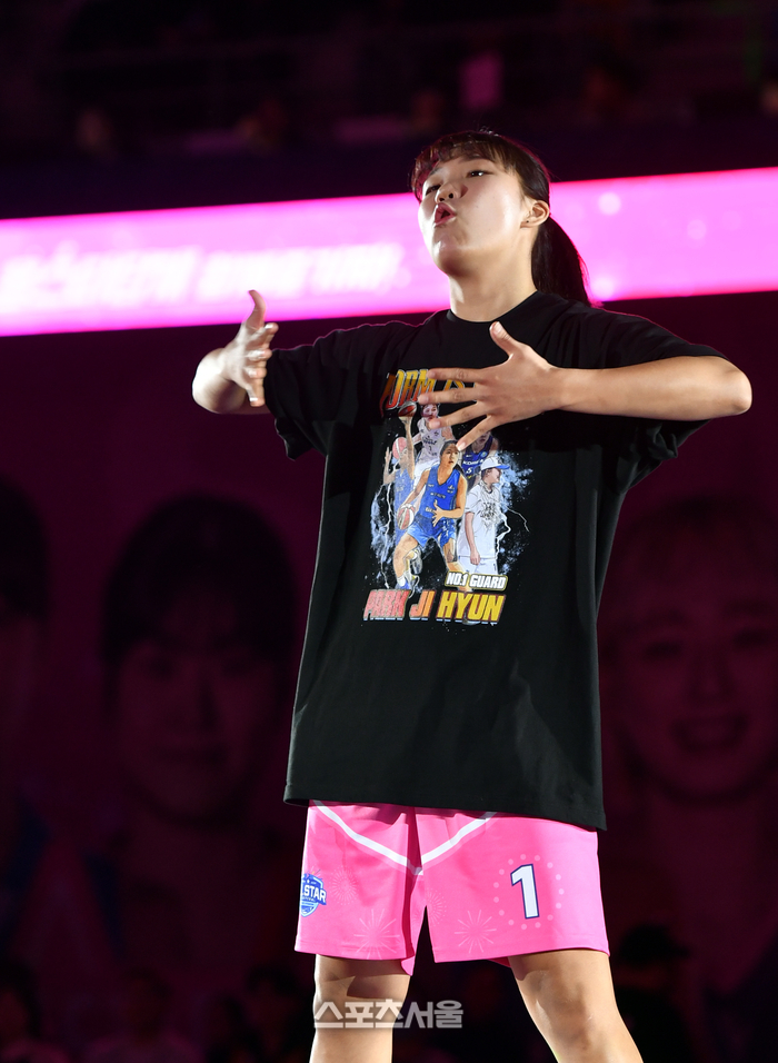최다득표를 기록한 박지현이 7일 아산 이순신체육관에서 열린 우리은행 우리WON 2023-2024 WKBL 핑크스타와 블루스타 올스타전에서 입장하며 댄스를 선보이고 있다 . 2024.01.07. 아산 | 강영조기자 kanjo@sportsseoul.com