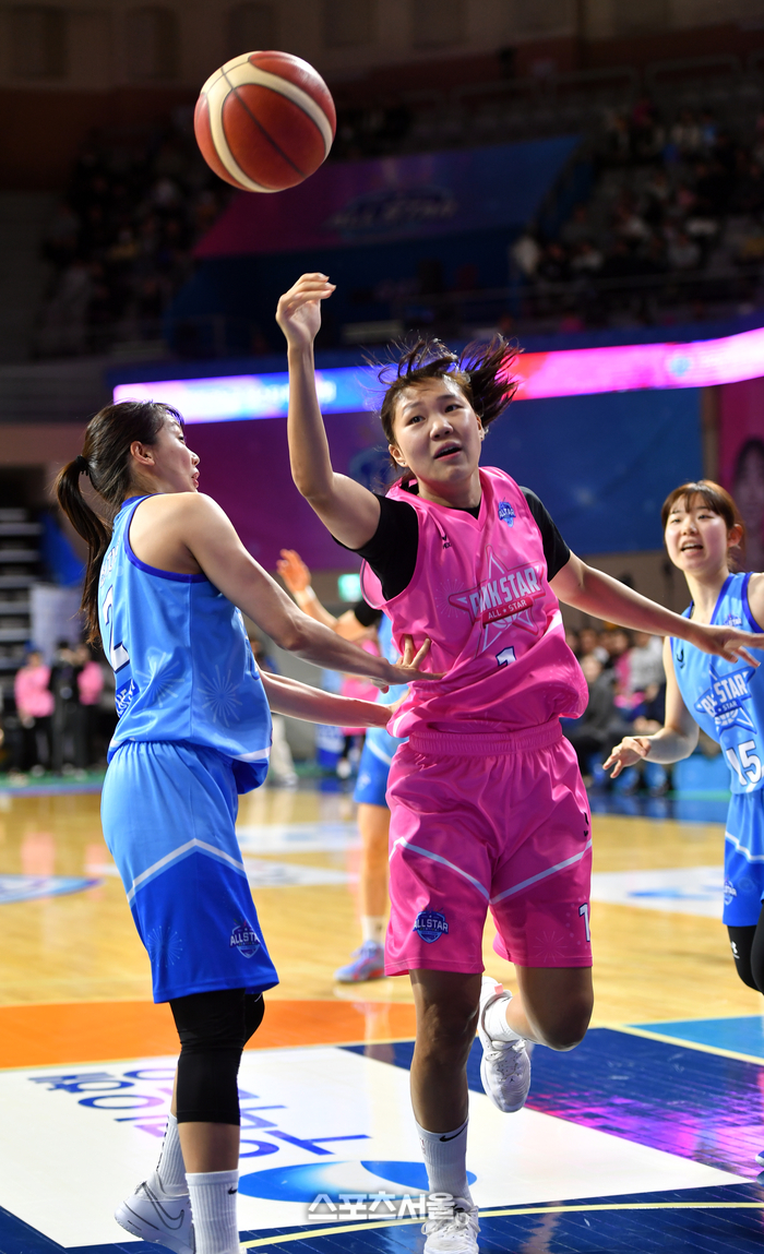 핑크스타 박지현이 7일 아산 이순신체육관에서 열린 우리은행 우리WON 2023-2024 WKBL 핑크스타와 블루스타 올스타전에서 터치아웃되는 볼을 향해 몸을 날리고 있다. 2024.01.07. 아산 | 강영조기자 kanjo@sportsseoul.com