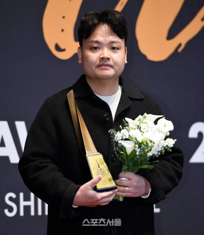 tvN ‘벌거벗은 한국사’ 전민호 PD가 9일 서울 장충동 신라호텔에서 열린 ‘2024 대한민국 퍼스트브랜드 대상’ 시상식에서 교양예능부문 프로그램상을 받은 후 포토월에서 포즈를 취하고 있다. 2024. 1. 9. 최승섭기자 thunder@sportsseoul.com