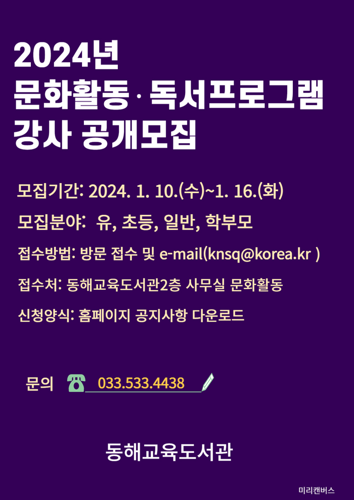 [스포츠서울ㅣ김기원기자] 강원특별자치도교육청동해교육도서관(관장 장병진)은 1월 10일(수)부터 1월 16일(화)까지, 2024년 문화활동·독서프로그램 강사를 공개 모집한다.