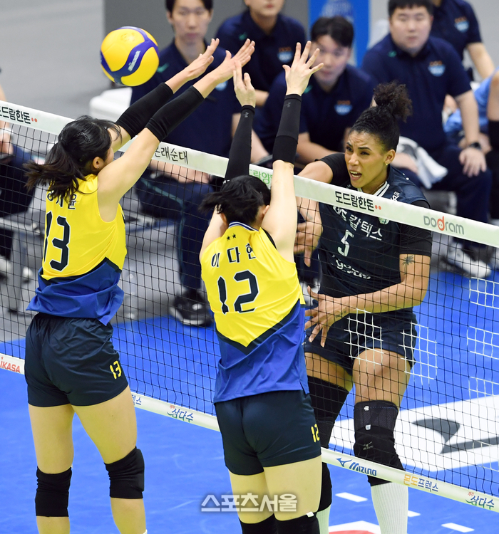 GS칼텍스 실바(오른쪽)가 10일 수원체육관에서 열린 2023-2024 V리그 여자부 현대건설과 경기에서 스파이크 공격을 하고 있다. 2024. 1. 10. 수원 | 박진업 기자 upandup@sportsseoul.com
