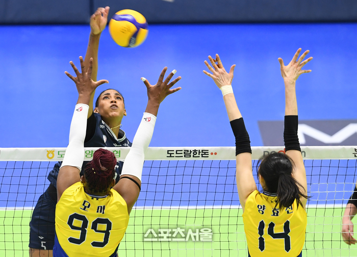 GS칼텍스 실바(왼쪽 위)가 10일 수원체육관에서 열린 2023-2024 V리그 여자부 현대건설과 경기에서 스파이크 공격을 하고 있다. 2024. 1. 10. 수원 | 박진업 기자 upandup@sportsseoul.com