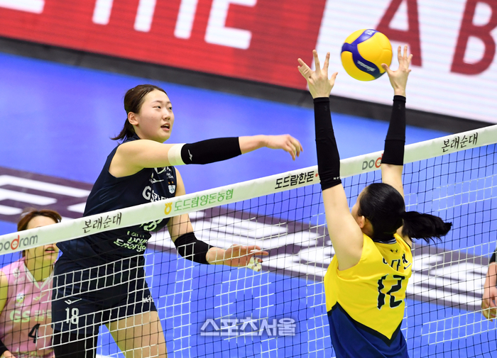 GS칼텍스 권민지(왼쪽)가 10일 수원체육관에서 열린 2023-2024 V리그 여자부 현대건설과 경기에서 속공을 하고 있다. 2024. 1. 10. 수원 | 박진업 기자 upandup@sportsseoul.com